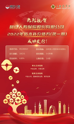 7月21日,上海清算所支持利安人寿保险股份有限公司(以下简称利安人寿)成功发行2022年第一期资本补充债券。本期债券是上海清算所登记托管的首单保险公司金融债券、首单保险公司资本补充债券,也是上海清算所落实监管要求、助力完善保险公司资本补充机制和提高保险业风险抵御能力的有力举措,体现了金融基础设施服务金融供给侧结构性改革的责任担当。本期债券发行规模10亿元,发行利率4.8%,认购倍数2.6倍,受到市场广泛认可。