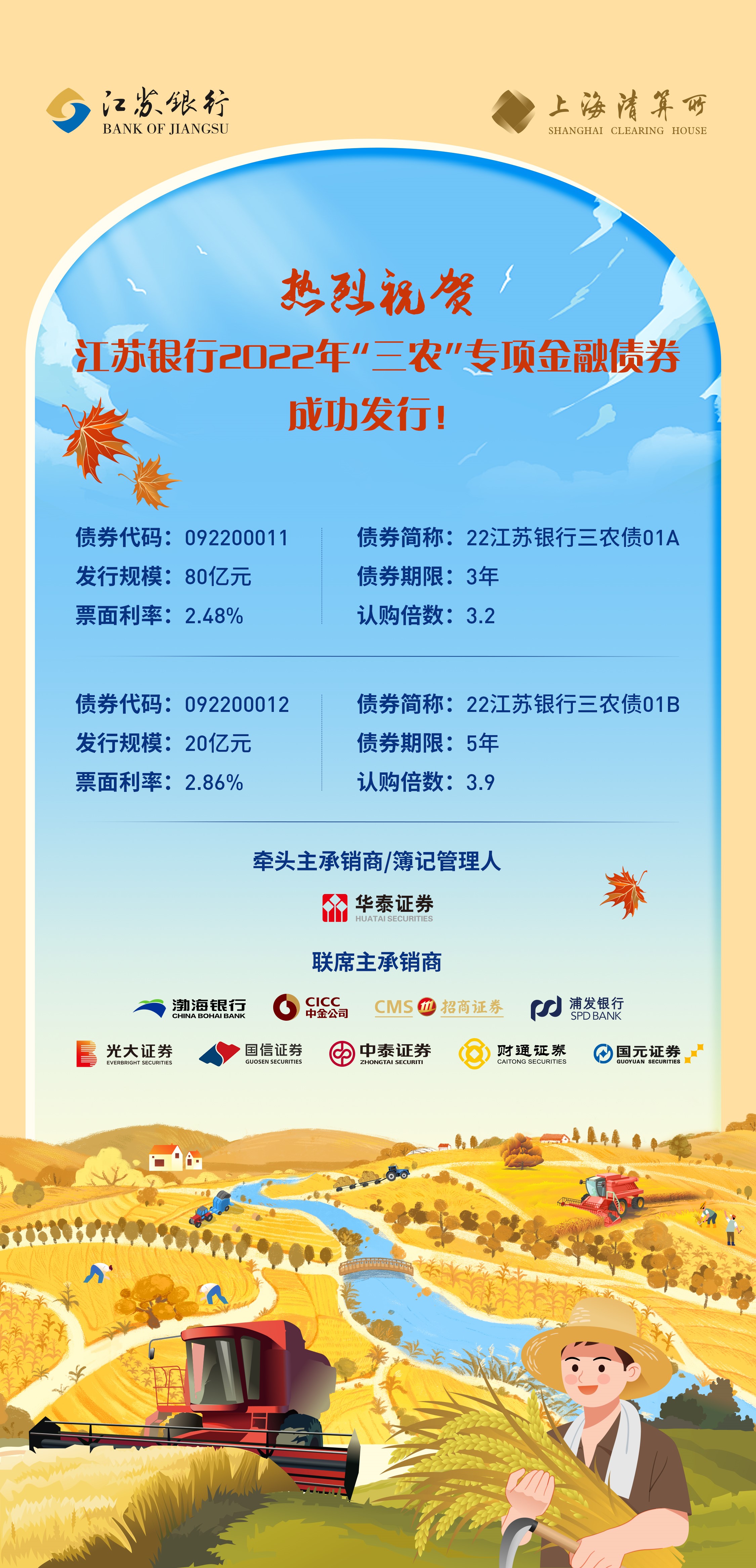 9月26日,上海清算所支持江苏银行成功发行“三农”专项金融债券,募集资金全部专项用于发放涉农贷款,加大对“三农”领域的信贷支持。本期债券是上海清算所登记托管的首单单独冠以“三农”名称的专项金融债券,也是继商业银行二级资本债券、无固定期限资本债券、绿色金融债券、小微企业专项金融债券等产品后,上海清算所进一步丰富商业银行金融债券产品谱系的又一重要进展。本次同步发行的3年期、5年期两个品种,发行规模分别为80亿元、20亿元,发行利率分别为2.48%、2.86%,认购倍数分别达3.2、3.9,投资者认购踊跃。
