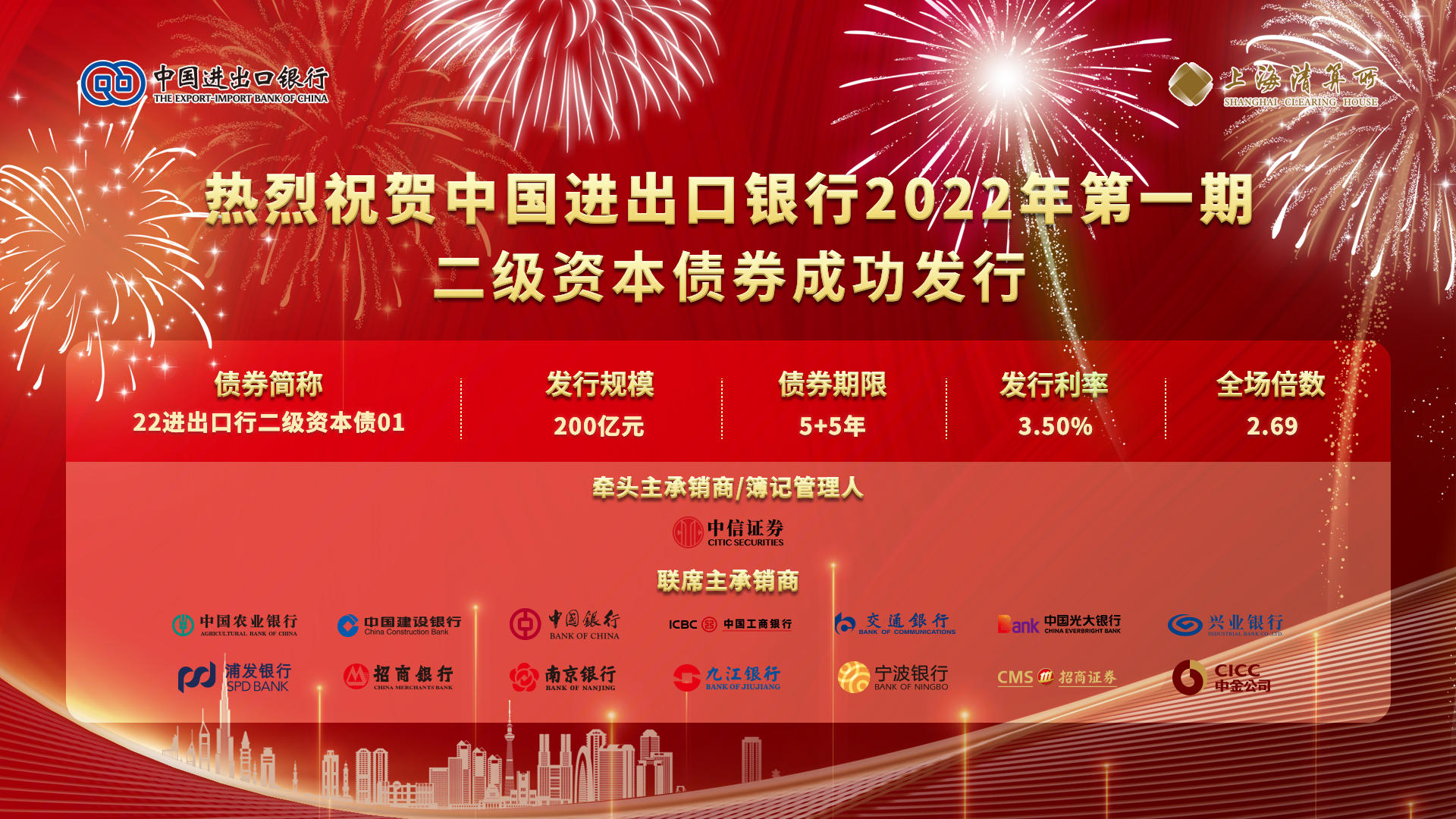 12月28日,上海清算所支持中国进出口银行成功发行200亿元二级资本债券,发行期限为5+5年,发行利率为3.50%,认购倍数达2.69,受到市场广泛认可。本期债券是上海清算所登记托管的首单政策性银行资本补充债券,募集资金将全部用于补充中国进出口银行二级资本,优化资本结构,促进业务稳健发展。